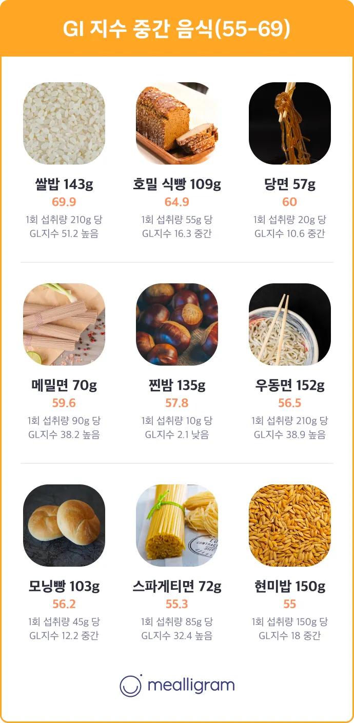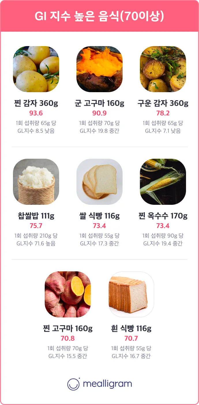 GI 지수는 탄수화물 50g을 기준으로 하기 때문에 해당 식품을 한 번에 얼마나 먹었는지를 고려하지 않은 수치입니다.
