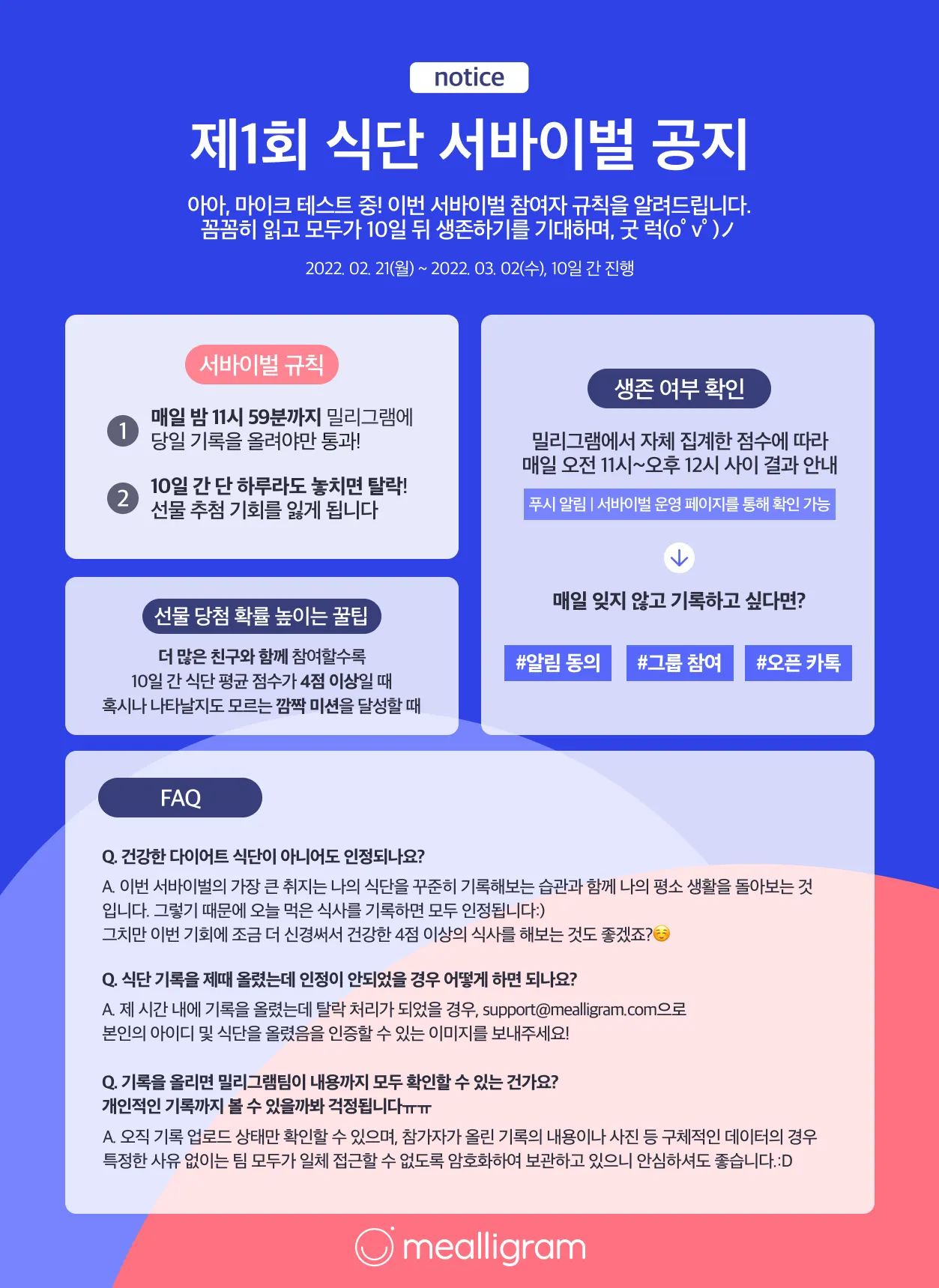 → 결론적으로는 한 끼라도 기록을 올리면 인정됩니다. 다만, 오늘 먹은 음식, 음료를 빠짐없이 기입한다는 마음으로 기록해주시는 걸 권장합니다! 이번 서바이벌은 ‘기록을 습관화'하는 것이 가장 큰 포인트니까요