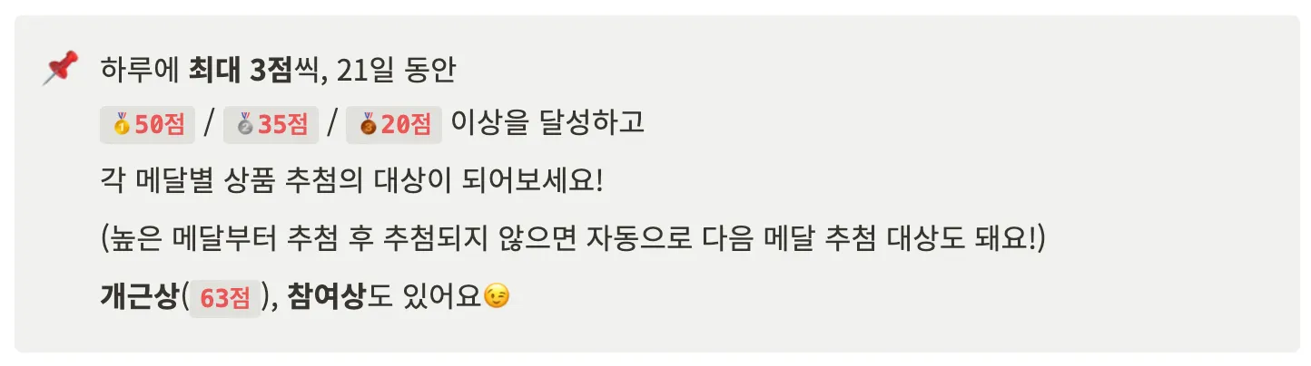 문의사항 반영, 규칙 검토(동일 멤버로 그룹 여러 개, 멤버 그룹 탈퇴, 사전 구글독스 제출 안 함 등) 후의 최종 점수가 공개되었습니다! 자신의 메달과 개근상 여부를 확인해 보세요