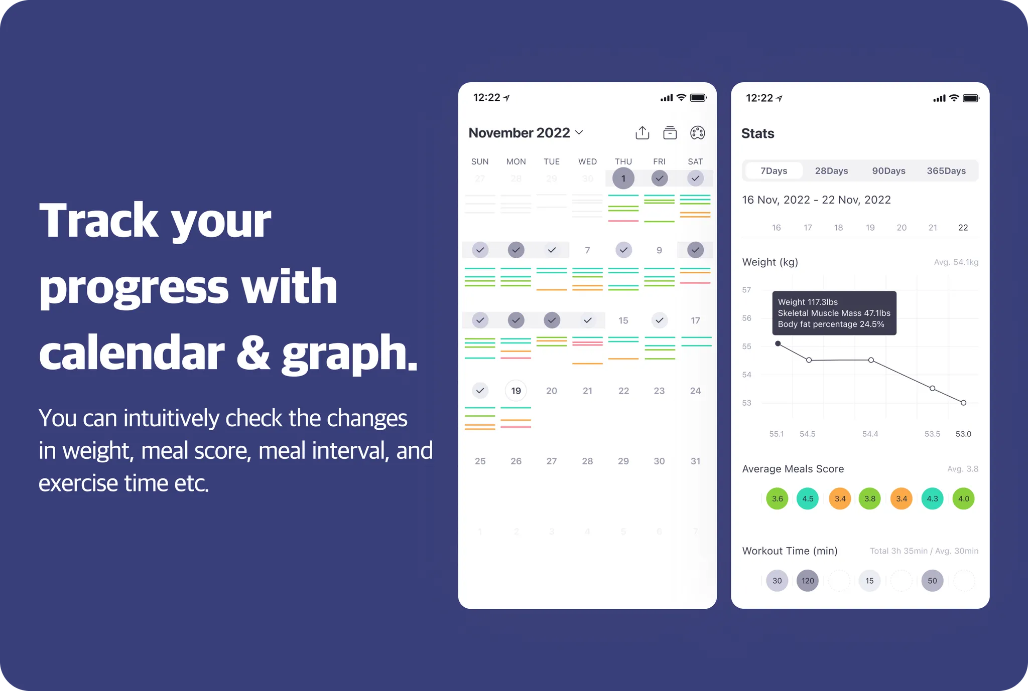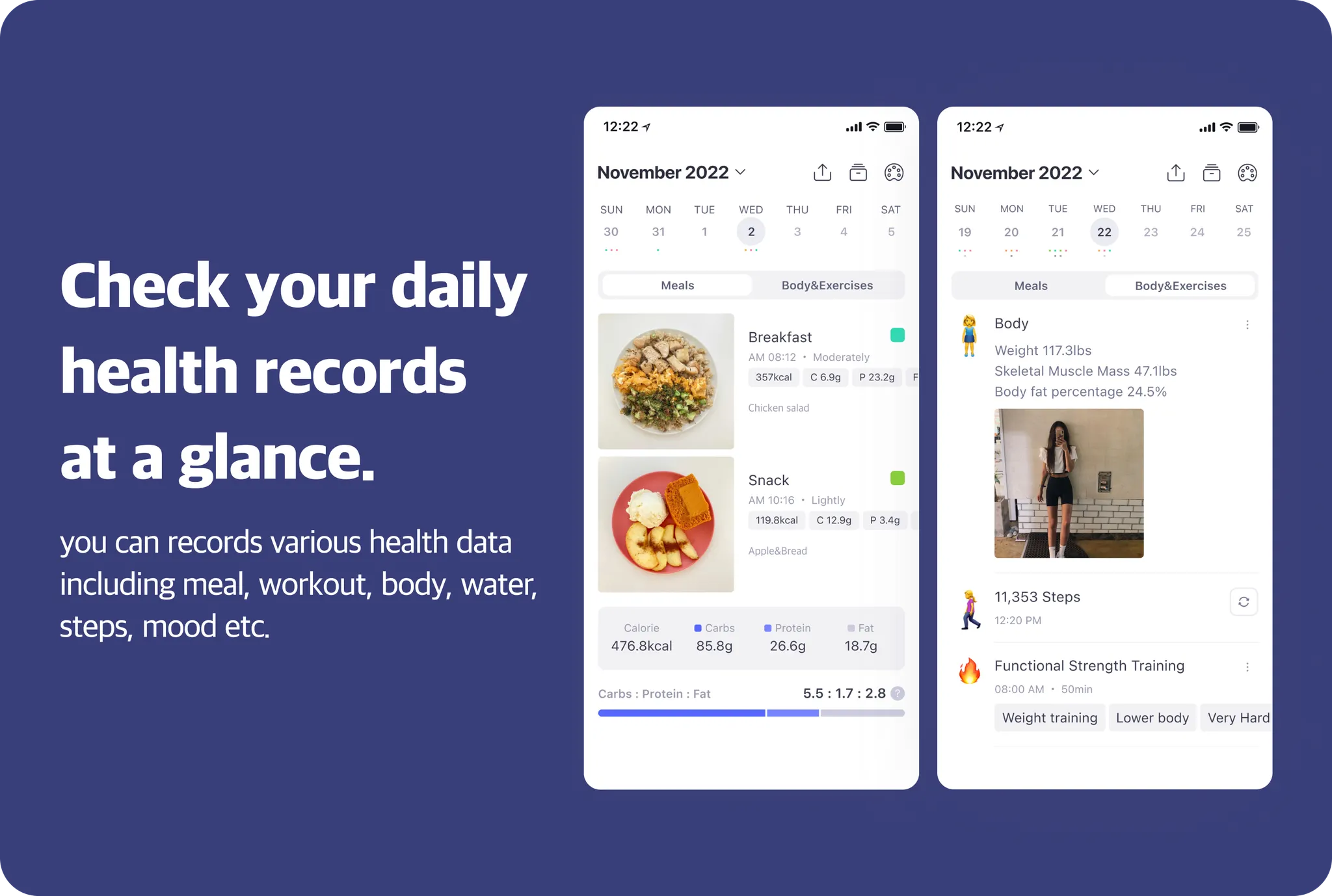 All weight management records, including meal, workout, body, water, and number of steps, can be managed in one place. Evaluate according to your standards and intuitively see how it changes every day
