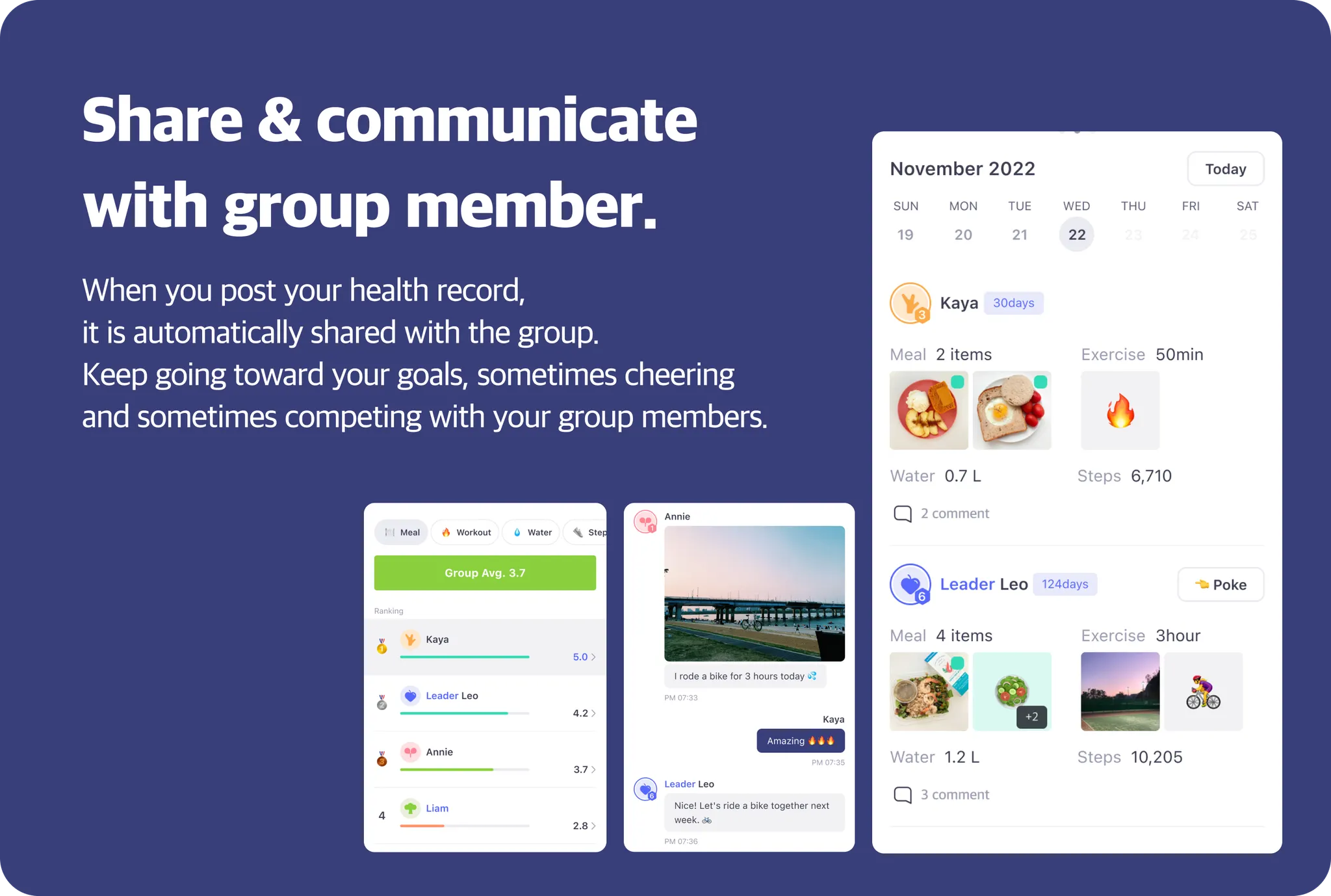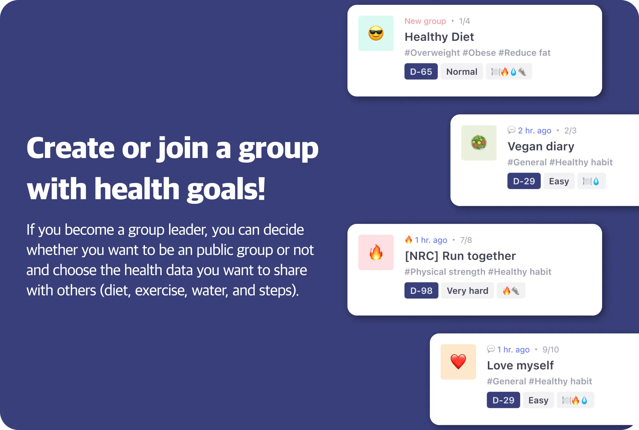 If you make a group according to your desired goal, You can share your health records in real time and communicate with group members. Cheer for each other, you'll find yourself practicing it consistently