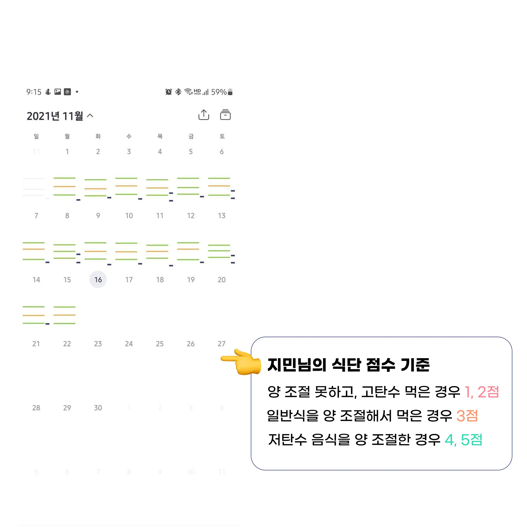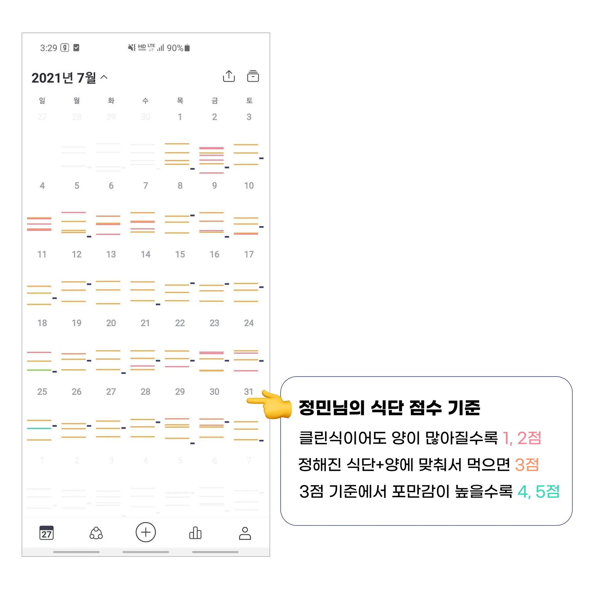 ③ 정한 기준에 따라 매일 먹은 음식에 스스로 점수를 주고, 캘린더를 통해 패턴을 확인한다