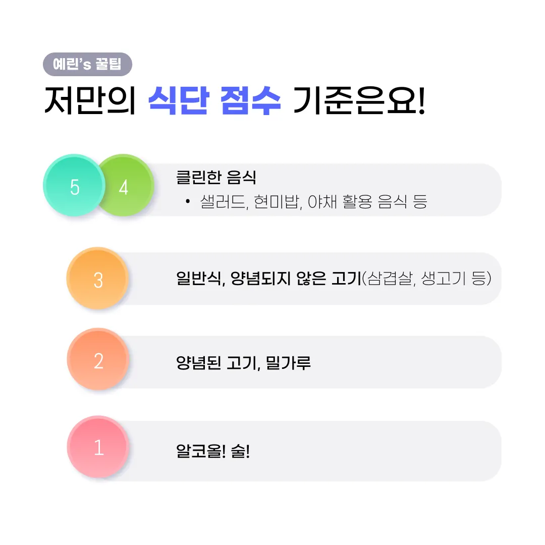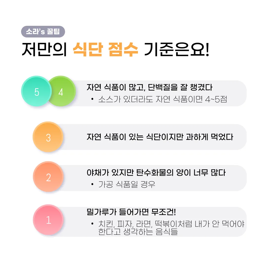 각자의 생활 습관, 목표에 따라 어떤 음식을 먹고 어떤 음식은 평소에 비해 자제해야겠다는 기준이 생기겠죠? 바로 이 기준에 따라서 1점~5점까지 스스로 진단하여 점수를 주면 됩니다