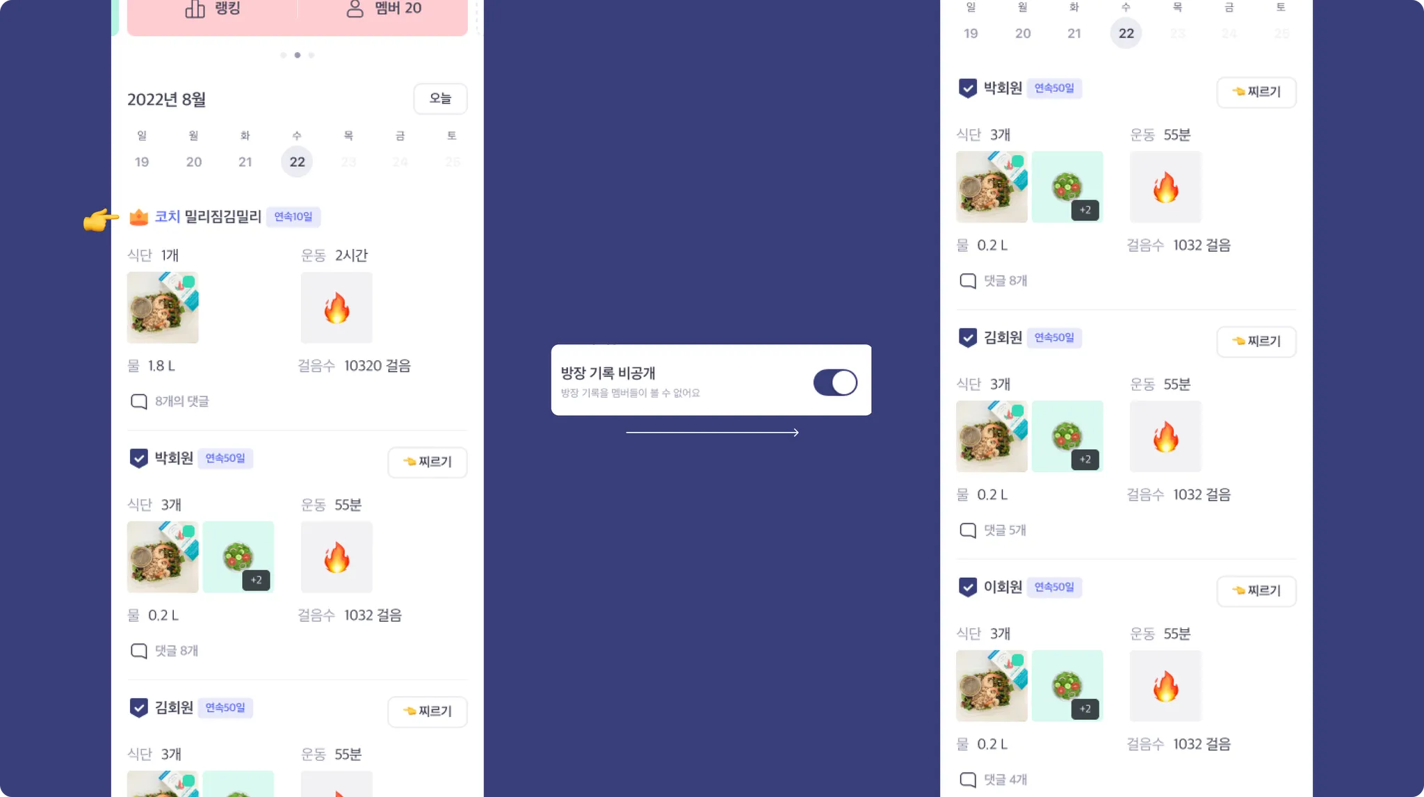 [방장 기록 비공개]를 통해 내 기록이 회원에게 보이지 않도록 설정 가능해요